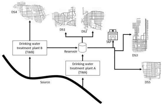 The relative influence of treated water quality on tap water quality and its hygienic implications has raised considerable attention and debate. The fundamental question raised is whether it is possible to determine the quality of water entering the distribution system that can ensure the maintenance of water quality throughout the primary and secondary distribution systems and, most importantly, in the building plumbing. If environmental conditions in building plumbing determine the abundance and diversity of fixed and suspended biomass, then local management and on-site treatment may be the most effective solutions to maintain water quality up to the tap. The impact of the primary distribution system on water quality has been documented in terms of loss of disinfectant residual, bacterial indicator compliance, and bacterial biomass []. Industry focus was placed on biological stability, not taking into account the hygienic implications of the diverse bacterial communities selected through that process [,]. The new frontier is complex building plumbing in which health-relevant water quality changes can occur [,]. Clear and evident changes in the planktonic bacterial community structures are expected to occur between the water’s source and water after subsequent steps of treatment, as previously reported in chloraminated systems [,]. Nevertheless, after treatment, results from several studies using high-throughput sequencing to examine changes occurring in DWDS suggest that planktonic bacterial communities leaving the plant remain relatively stable throughout distribution up to the water meter [,,], questioning the impact of water residence time and/or the presence of a disinfectant residual on microbiota. However, when it comes to building plumbing, stagnation and pipe material have been shown to be important factors influencing the bacterial composition [,,].