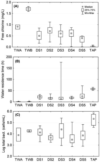 Box plots showing the water quality across the subsystems (treated water (TW), distribution system (DS), and building plumbing (TAP)): (A) Free chlorine, (B) water residence time, and (C) log of total bacterial counts.
