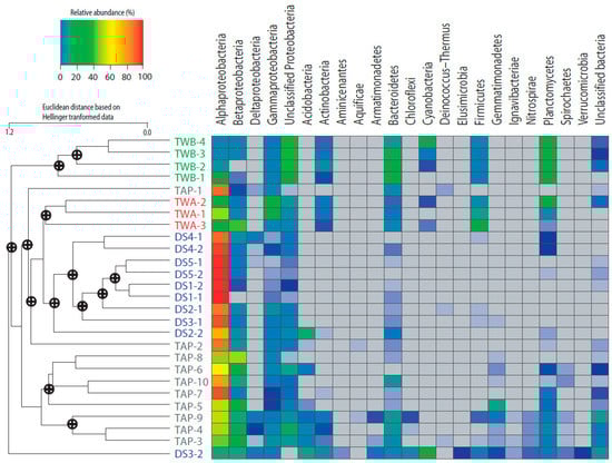 Heat map illustrates the relative abundance of different phyla and Proteobacteria classes in treated water (TW), distribution system (DS), and tap water (TAP) samples. Hierarchical clustering of samples is based on the similarity profile analysis of their bacterial community profiles (significant clusters at α = 0.05). Samples with similar community structure cluster together, taking into account the relative abundance of each OTU.
