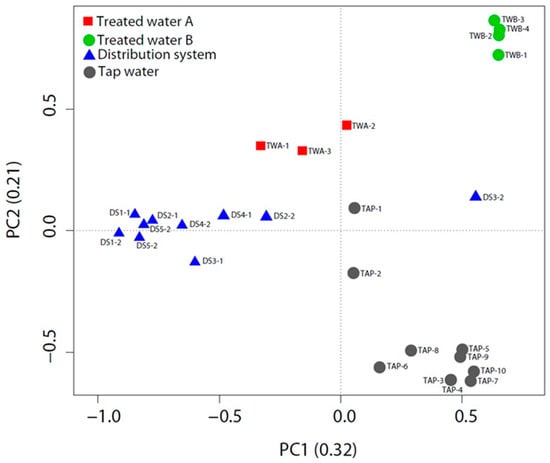 Analyses of TAP samples enabled identification of 11 bacterial phyla. Proteobacteria was once again the most abundant phylum (91% ± 9%), with Alphaproteobacteria (65% ± 20%), Betaproteobacteria (18% ± 15%) as the most abundant representative classes. The building tap samples presented very similar composition, with eight out of ten tap samples clustering together (Figure 3). Two different taps (TAP1 and TAP2) clustered separately from the others, closer to distribution system and treated water samples. These samples, which were taken from the intensive care department on the third floor of the hospital building used for our study, had the lowest total bacterial counts and water residence times. A larger proportion of Alphaproteobacteria was observed compared to the other taps. Moreover, TAP1 was located in a bathroom and TAP2 was near the entrance of the building, so these taps experienced less stagnation. The bacterial structures in the other taps were similar and grouped according to stagnation time and locations. TAP3 and TAP4 were taken from the transplantation department on the sixth floor. TAP9 was from the neonatology unit on the fourth floor. TAP3, TAP4, and TAP9 had the highest total bacterial counts and the lowest abundance of Proteobacteria (74–85%) and Alphaproteobacteria (44–52%). The remaining taps (TAP5, TAP6, TAP7, TAP8, and TAP10) were located in the departments of transplant and oncology on the second and third floors, respectively, and formed a significant cluster. These differences between taps suggest that specific conditions at each location (hydraulics, material, patterns of use, etc.) are likely drivers in the variability of the classes of Proteobacteria present.