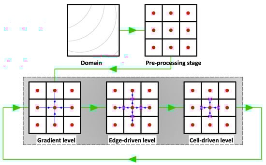 As our model employs a reconstruction process to spatially achieve second-order accuracy with the MUSCL method, it requires the gradient values at cell-center. Therefore, these gradient values must firstly be computed. This step is called the gradient level. Hereafter, one requires to calculate the values at each edge using the values of its two corresponding cell-centers. This stage is then called the edge-driven level. In this level, a solver, e.g., HLLC, Roe, or CU scheme, is required to compute the non-linear values of and at edges. Prior to performing such a solver, the aforementioned reconstruction process with the MUSCL method was employed. Note the values of are also computed at the edge-driven level. After the values of all edges are known, the solution can be advanced for the subsequent time level by also computing the values of . For example, the solutions of at the subsequent time level for a cell-center are updated using the , , and values from its four corresponding edges—and using values located at the cell-center itself. We call this stage the cell-driven level.