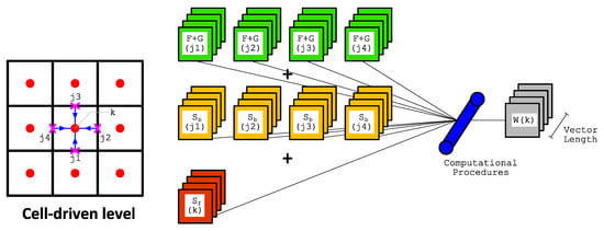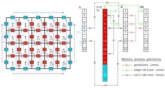 Note that the edge-driven level is the most expensive stage among the others; one should thus pay extra attention to its computation. We also point out here that we apply the computation for the edge-driven level in an edge-based manner rather than in a cell-based one, namely we compute the edge values only once per single calculation level. Therefore, one does not need to save the values of in arrays for each cell-center; only the values of are saved corresponding to the total number of edges, instead. The values of an edge are only valid for one adjacent cell—and such values are simply multiplied by () for another cell. It is now a challenging task to design an array structure that can ease vectorization and exploit memory access alignment in both the edge-driven and cell-driven levels.