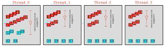 In Figure 4 we show an example of the decomposition of the domain in Figure 3 using four threads; for the sake of brevity, the illustration is given only for the edge-driven level. The parallel directive, e.g., , can easily be added to each loop, thus according to Algorithm 2, in the gradient level the domain is decomposed as: thread 0 (cells 6, 7, 1, 17, 5, 8), thread 1 (cells 10, 11, 2, 18, 9, 12), thread 2 (cells 14, 15, 3, 19, 13, 16), and thread 3 (cells 4, 20). Similarly, regarding Algorithm 3 it gives in the edge-driven level: thread 0 (edges 1–4, 17–22, 32–33, 37–38, 42, 46), thread 1 (edges 5–8, 23–25, 34, 39, 43, 47), thread 2 (edges 9–12, 26–28, 35, 40, 44, 48), and thread 3 (edges 13–16, 29–31, 36, 41, 45, 49). Meanwhile, the cell-driven level applies a similar decomposition to that of the gradient level. One can see, the largest loop components, e.g., internal edges 1–4, 5–8, etc., are decomposed in a contiguous pattern easing the vectorization implementation, thus efficient. Note the decomposition in Figure 4 is based on static load balancing that causes load imbalance due to the non-uniform amount of loads assigned to each thread; this load imbalance will become less and less significant as the domain size increases, e.g., to millions of cells. However, another load imbalance issue—which can only be recognized during runtime—appears, namely the one caused by wet–dry problems, where wet cells are computationally more expensive than dry cells. For this, we have developed in [21] a novel weighted-dynamic load balancing (WDLB) technique that was proven effective to tackle load imbalance due to wet–dry problems. All the parallel and load balancing implementations are described in detail in [21], thus are not explained here. We also note that we have successfully applied this cell-edge reordering strategy in [24,25] for parallelizing the 2D shallow flow simulations using the CU scheme with good scalability. Yet, we will show in the next section that the cell-edge reordering strategy proposed can help in easing all the vectorization implementations.