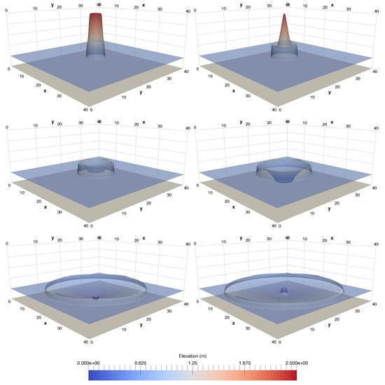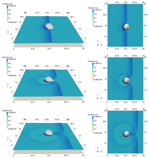 The domain was discretized into 200,704 rectangular cells (402,304 edges). The simulation time was set to 20 s with = 0.002 s leading to 10,000 time steps. One can see in Figure 12, the incident solitary waves in front of the island, which generate a high run-up at about t = 9 s, create wet–dry mechanisms on the conical island. Within this period, the maximum magnitude was reached. After t = 9 s, the waves started to run down the inundated area on the conical island. Some waves were refracted and propagated toward the lee side of the island, where two waves were trapped at each side of the island at around t = 11 s. At t = 13 s, the second wave run-up was generated after these two waves collided. Afterwards, these waves continued to propagate around the island.