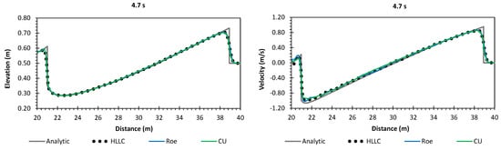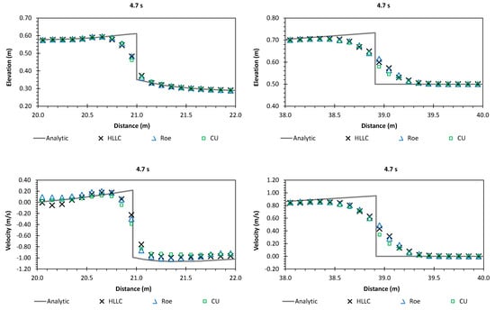 We present the comparison between the analytical and numerical results at 4.7 s in Figure 6 showing that all schemes can simulate this highly discontinuous flow properly. To point out the difference between the three schemes more clearly, we present in Figure 7 both the depth and velocity profiles near the two discontinuous areas: 20–22 m and 38–40 m, where only non-significant differences are shown.
