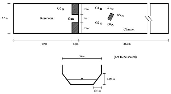 This case was done experimentally in [31]. The channel was trapezoidal; 35.8 m long and 3.6 m wide. A 1 m wide rectangular gate separated the upstream reservoir from the downstream channel, see Figure 8. The Manning coefficient was 0.01 . A 0.8 × 0.4 m obstacle was located on the downstream channel with a position that formed an angle of from the x-axis. The water was set initially to 0.4 m at the reservoir and 0.02 m at the channel, thus the banks at downstream were dry. The upstream end of the reservoir was a closed wall. In this paper, the domain was discretized into 143,280 rectangular cells (285,246 edges). The simulation was set for 30 s with = 0.005 s, thus requiring 6000 time steps.
