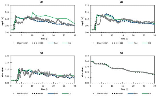 We compared our model at four points: G1 (10.35, 2.95) m, G4 (11.7, 1.0) m, G5 (12.9, 2.1) m, and G6 (5.83, 2.9) m. Our numerical results are given in Figure 9 showing that our model is in general capable of simulating this case properly. At G1, the maximum bore around 2 s was accurately simulated by all schemes, where there were no significant differences shown until 9 s. However, after 9 s, the CU scheme computed the results higher than do the other schemes, where both the HLLC and Roe schemes show almost no different results. At G4, the first bore around 2 s was predicted with a later time of no more than 1 s and a higher depth of no more than 2 cm, where all schemes kept producing the higher values from 2 s to 4.5 s. At G5, no significant differences were again shown between the HLLC and Roe schemes, but the CU scheme showed slightly different values. At G6, highly accurate results were given by all schemes to simulate the water at the reservoir, showing that the schemes can predict the correct incoming discharge from the upstream reservoir to the downstream channel.