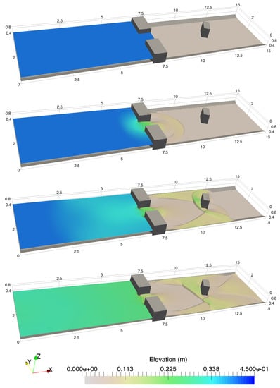 Some errors computed by our model are probably due to the absence of the turbulence terms. Yu and Duan [32] showed the turbulence model was highly important for simulating flow field around the obstacle, where the reflection waves from the obstacle and side walls have superimposed several oblique hydraulic jumps. In Figure 10, we visualize the flood propagation at 1, 3, and 10 s using the CU scheme.