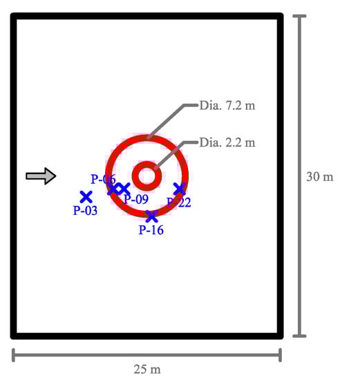 where , , and are the amplitude of the incident wave, still water depth, and time, at which the wave crest enters the domain—set to 0.032 m, 0.32 m, and 2.45 s, respectively. The other three boundaries were closed boundaries. We compared our results with the values at five gauges located on the domain: P-03, P-06, P-09, P-16, and P-22, whose coordinates were (6.82,13.05) m, (9.36, 13.80) m, (10.36, 13.80) m, (12.96, 11.22) m, and (15.56, 13.80) m, respectively. The Manning coefficient was set to zero as suggested by [34].