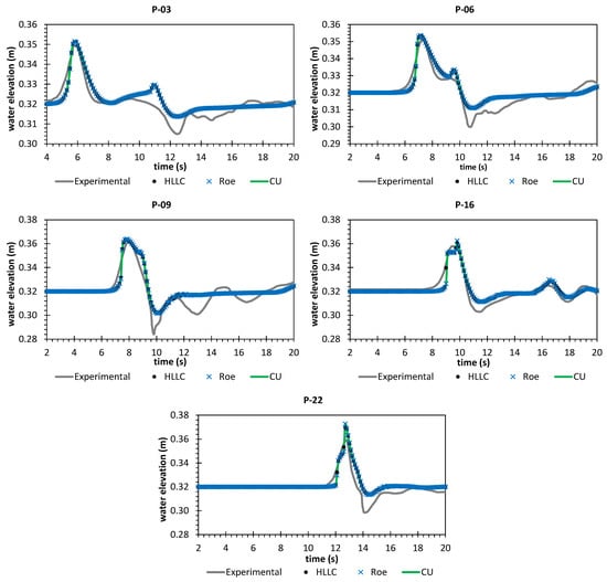 Our numerical results are also compared with laboratory results during 20 s, see Figure 13. Accurate results were produced by all schemes, where no significant differences between them were shown. The arrival times of the highest waves were accurately detected at gauges P-03 and P-22. All schemes rendered later times at gauges P-06, P-09, and P-16 but the differences were no more than 1 s. At gauge P-16, our model computed the wave 1 cm higher than the one mentioned in the laboratory data, and the wave at gauge P-22 was computed 1.3 cm higher. This was probably due to the neglect of the dispersion effects. Note that such discrepancies were also reported in the numerical model of [34].