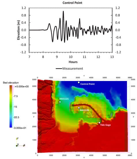 This benchmark test is a real tsunami case that occurred in 2011, Japan. The data set was recorded in Hilo Harbor, Hawaii. The raw data can be found in [35]. To avoid the phase differences of the incident wave, the original bathymetry data should be flattened at the depth of 30 m. Interested readers are also referred to [36] for more information. In Figure 14, the sketch of the domain is given as well as the incident wave forcing employed at the northern part as a boundary condition. The Manning coefficient was assumed to be uniform 0.025 . The observation points were the Hilo tide station for elevation (3159, 3472) m, HAI1125/harbor entrance (4686, 2246) m, and HAI1126/inside harbor (1906, 3875) m for velocities. The 1-minute de-tiding of raw data was done for the observed data.