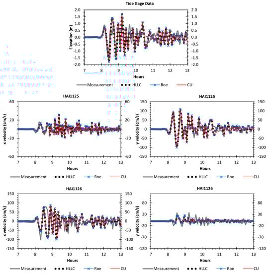 The domain was discretized using 20 m resolution rectangular cells producing 94,600 rectangular cells (189,200 edges). We set the simulation time to 13 h and used = 0.025 s giving 1,872,000 time steps. The results are given in Figure 15 plotted per 150 s. At the Hilo tide Station, each scheme can detect the first incoming wave quite accurately around t = 8.2 h. The lowest water elevation was also predicted properly at approximately t = 8.4 h but with a non-significant difference of about 0.2 m. After that, the water level fluctuations were also computed properly. At the harbor entrance, the velocities were in general accurately computed. Each scheme was able to compute the first incoming wave for the x velocity at t = 8.2 h. The y velocity magnitude at that time was, however, slightly overestimated. Inside the harbor, accurate predictions for x and y velocities were shown, where the first incoming wave was well predicted. After 10 h, each scheme kept exhibiting accurate results at the harbor entrance as well as inside the harbor. One can see that the water current flowed predominantly in North–South direction at the harbor entrance, whereas inside the harbor the water current flowed predominantly in East–West direction. Our results agree with the observed data and those simulated by [36] as well. Although some discrepancies—which are probably due to the neglect of the tidal current effects—still exist, our model shows overall quite accurate results for this hazard event.