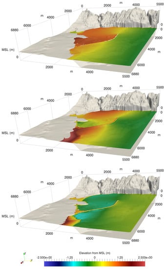 In Figure 16, the visualizations of tsunami inundation are presented using the CU scheme. It is shown at around 9.03 h, the water level reaches approximately 0.5–1 m at the harbor entrance. Meanwhile, the water level is predicted to reach 1–1.5 m inside the harbor. At about 9.53 h, the water level at the harbor entrance remains relatively constant for 0.5–1 m but outside the harbor (near the breakwater) the water level becomes higher up to 2.5 m. After 14 h, the water level near the breakwater (inside and outside the harbor) decreases to approximately −1.25 m. Complex wet–dry phenomena near the coastline as well as the breakwater appear during the simulation time and our model has shown to be robust for modeling such phenomena.