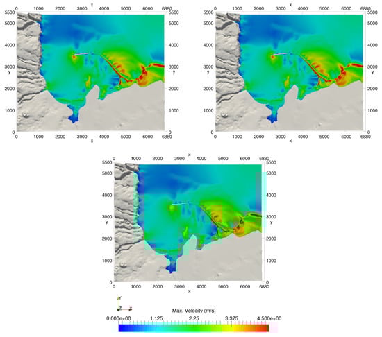 We show in Figure 17 a visualization of the maximum velocity magnitude captured by the HLLC, Roe, and CU schemes during 13 h simulation time. In general, as one can see, no significant differences are shown between all schemes. Along the outer side of the breakwater as well as near the harbor entrance, the velocity magnitudes of more than 4.5 m/s appear. Meanwhile, considerably lower magnitudes are shown inside the harbor. The main difference is only located near the harbor entrance, where the CU scheme computes the slightly lower magnitudes. The spatial distribution of the velocity magnitude is shown to be extremely sensitive, in agreement with that studied in [36].