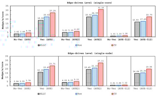 As soon the guided vectorization was activated, the performances of each scheme in the edge-driven level increased significantly. For the AVX machine (1 core), we observed significant improvements being 5.5×, 6.5×, and 6× for the HLLC, Roe, and CU schemes, respectively; this shows the Roe scheme experiences remarkably the benefit of the vectorization, for which the improvement factor is larger than the others. For the AVX2 machine (1 core), the speed-up factors of 4.5×, 4.8×, and 5× were obtained by the HLLC, Roe, and CU schemes, respectively showing that the improvement factor of the CU scheme becomes the largest one among the others. Although significant performance improvements have been shown, our model still cannot fully exploit the theoretical speed-up of 8× from the vector widths of both the AVX and AVX2 machines used. Nevertheless, we have shown that the data structures of our code are suitable for SIMD instructions as we are able to achieve the efficiency of up to 81.25%. Note in the aforementioned notable works, none of the models could achieve the performance increase of more than 52% from the theoretical speed-up of the machine used. In [20], the average speed-up of 4.1× was achieved on AVX machine (single-precision) for the vectorized augmented Riemann solver; therefore, this leads to the efficiency of 51.25%. In [22], the average speed-up of 1.7× was obtained on an AVX2 machine (double-precision) for the vectorized Riemann solver; this thus gives the efficiency of 42.5%.