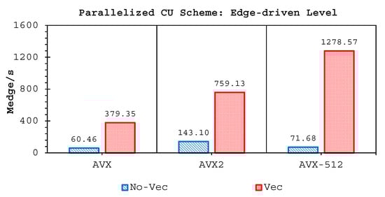 Single-node performance of the non-vectorized and vectorized CU scheme with parallelization (edge-driven level).