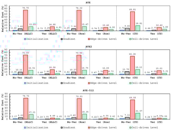 The second most expensive part is the cell-driven level, which consumes around 16–22% of the total simulation time with the non-vectorized solvers. After vectorization, the cost of the cell-driven level decreases from approximately 17% up to 5% on both the AVX and AVX2 machines. Meanwhile, on the AVX-512 machine, the vectorization has helped by decreasing the computational time of the cell-driven level averagely from 19% up to 3%; this again shows the vectorization works more effectively on this machine.