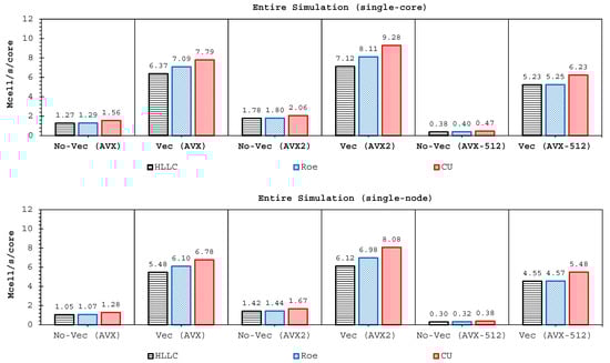 We now explain the performance of our model for updating the entire simulation. For the AVX, AVX2, and AVX-512 machines with one core, we observed for the non-vectorized solvers the metrics of 1.27–1.56, 1.78–2.06, and 0.38–0.47 Mcell/s/core, respectively—and for the vectorized solvers by 6.37–7.79, 7.12–9.28, and 5.23–6.23 Mcell/s/core, respectively. We achieved the improvements for the AVX machine by 5×, 5.5×, and 5× for the HLLC, Roe, and CU schemes, respectively, while for the AVX2 machine, the speed-up factors of 4×, 4.5×, and 4.5× were obtained by the HLLC, Roe, and CU schemes, respectively. On the AVX-512 machine we observed the speed-up factors of 13.91×, 13.11×, and 13.18× for the HLLC, Roe, and CU schemes, respectively showing that, on this machine, our code can achieve a better performance than those on the other two machines. However, the AVX2 machine still gives the highest metrics among the others.