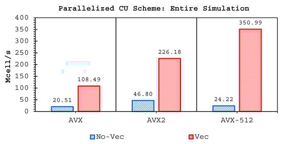 Single-node performance of the non-vectorized and vectorized CU scheme with parallelization (entire simulation).