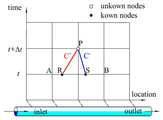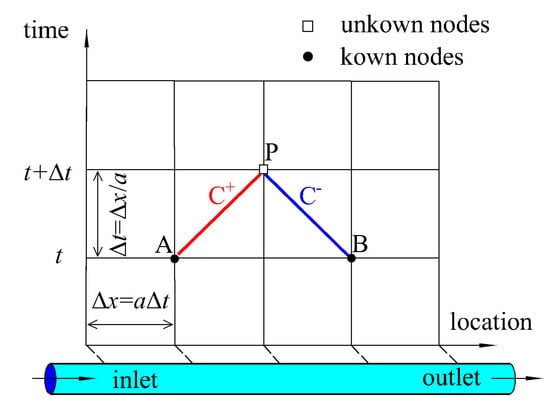 After the pipe is filled, the liquid flow becomes pressured, and the pressure wave speed multiplies immediately. The characteristic equations are expressed as Equations (5) and (6) [23], and the node meshing is shown in Figure 3:
