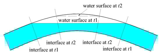 where and are the fluid velocities at the nodes and , respectively; and are the water levels at the nodes and , respectively; and are the energy gradients at the nodes and , respectively; and are the cross-sectional areas of the liquid at the nodes and , respectively; and are the locations at the nodes and , respectively; is the acceleration due to gravity; denotes the time step; is the inlet discharge in the transverse direction per unit length; is the original energy gradient due to the inclination between the pipeline and the horizontal plane; and is defined to be equal to , where denotes the width of the water surface at that node, as shown in Figure 2.
