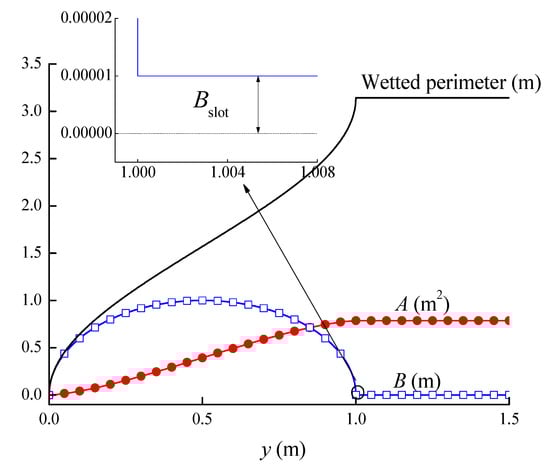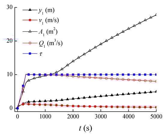 In the case of a tube of diameter 1.0 m, the pressure wave speed of the pressured pipe flow is assumed to be 1000 m/s. The parameters of a pipeline profile with the virtual slot are shown in Figure 6. Thus, the two conditions are combined into one corresponding equation set, and therefore can be simulated in a single model using Equations (1)–(4) as a general presentation. The solution can be accessed in FORTRAN, expressing the derived equations as follows: