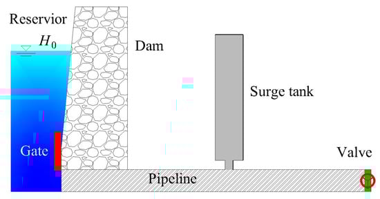 In this study, a single pipeline with a surge tank is considered as an example. The water level H0 in an upstream reservoir is regarded as a constant at 10 m. A gate is set at the upstream entrance of the pipeline to control the inlet discharge, and a valve is set at the downstream exit to control the outlet. A surge tank is located in the middle of the pipeline to control the extreme pressure in water hammers. The parameters are listed in Table 1. The model of the water supply system is shown in Figure 7.