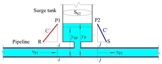 where , , and are the water levels at the nodes P, A, and B, respectively, when they are higher than the diameter of the pipe; is the pressure wave speed; and , , and are the discharges through the profiles at the respective nodes P, A, and B.