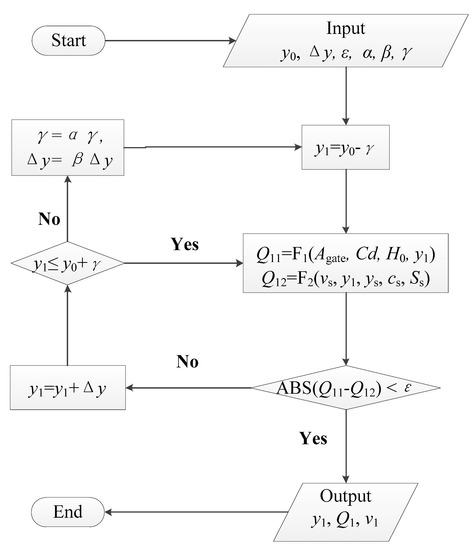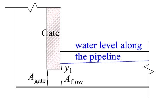is the discharge coefficient of the gate, which depends on the valve performance curve and opening ratio at a particular time; is the cross-sectional area of the gate; y1 is the water level at the first profile in the pipeline; and denotes the pressure difference between both of its sides. The discharge can be obtained by multiplying the fluid velocity and the cross-sectional area.