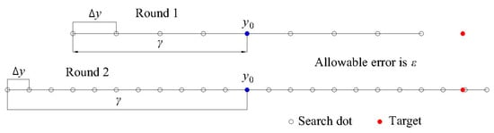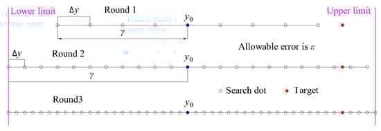 Here, y0 is the water level of the first profile at the last time step and the input as the initial value in the iteration process to obtain y1, the water level of the first profile at the new time step; ∆y is the search step; ε is the allowable error, which represents the accuracy; γ is the search zone; and α ∈ (1, +∞) and β ∈ (0, 1) are the forward coefficients of γ and ∆y, respectively. Figure 12 shows a two-round iteration search process of the DFM.