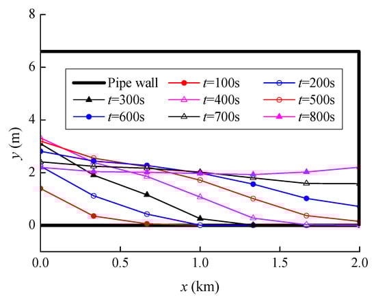 In the water filling process, the open ratio of the upstream gate increases from 0.0 to 0.1 in 10 min, while the downstream valve is kept tightly closed. At the beginning of the water filling process, the flow velocity rapidly rises to a relatively high value and then reduces slowly as the water level increases smoothly (as the discharge of the first profile). Meanwhile, the liquid cross-sectional area and water level continue to rise. Figure 13 shows the changing process of the parameters of the first profile during the filling process (Stage 1), and Figure 14 shows the water level along the pipeline during the first 800 s.