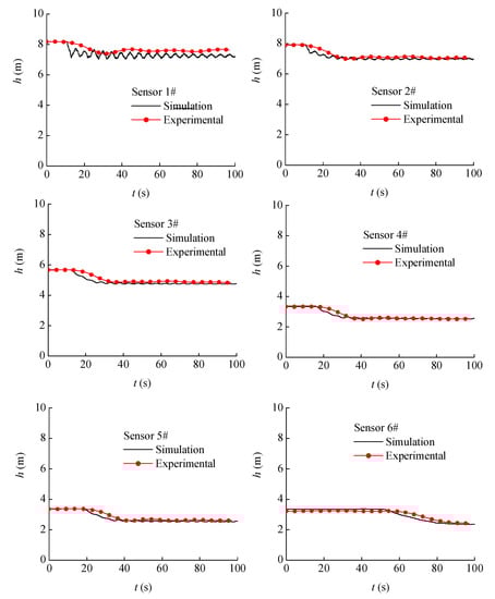 For validation of the DFM, a transient process caused by partly closing the upstream valve, where part of the pipeline is pressured flow and the other is free surface flow, was numerically simulated using the DFM and was experimentally measured for comparison. Six sensors were located from upstream to downstream for recording the pressure changing process. The comparison between experimental data and the simulation is shown in Figure 17. As can be seen, the simulation results basically agreed with the experimental data on the trend of the pressure processes at all six sensors. In detail, the oscillation shown in the simulation results was more obvious than the measured data. This may have been a reflection of air contained in the pressured part or a little leakage in the experiment pipeline, since both of these can help reduce water hammer intensity and oscillation.