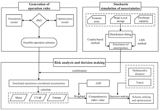 In this paper, the risk of reservoir group flood control operation was measured by analyzing the influence of uncertainties on the maximum occupied storage capacity of reservoir participating in the operation. The proposed method firstly derived a set of feasible multi-reservoir flood control operation schemes and simulated different uncertainties in flood control operation and then, multi-index analysis and multi-attribute decision-making are carried out for the risk in multi-reservoir flood control operation. Figure 1 shows the flow chart of the proposed methodology, and the specific descriptions of each step are presented in the following subsections.