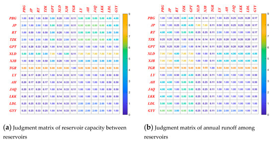 According to the average annual runoff and flood control capacity of each reservoir in Table 6, a hierarchical topological graph is established based on the flood capacity and the average annual runoff of each reservoir. The judgment matrices of the attribute of reservoirs were shown in Figure 5, the index number of the matrices were calculated by using pair-wise comparison using the 1-9 scale of AHP. The CR of these two judgment matrices is 0.049 and 0.054, which indicates that the judgment matrices have passed the consistence test. The weight vector of the reservoir’s storage capacity and runoff is defined as {0.5, 0.5}, and the weight of each reservoir is calculated as {0.0181, 0.0246, 0.0243, 0.0255, 0.0284, 0.0304, 0.0476, 0.0439, 0.1639, 0.1079, 0.0360, 0.0453, 0.0138, and 0.3901}.