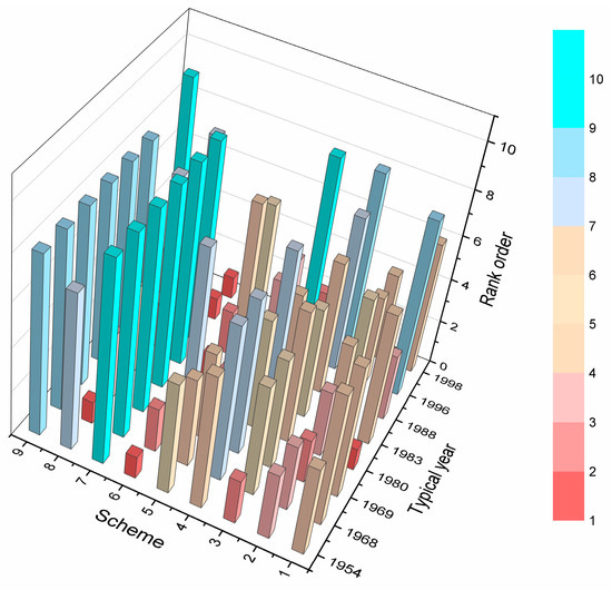 According to the proposed method, the optimal scheme can be selected. For example, for the 1% design flood in 1998, it is seen from Table S9 that the flood control effect of Scheme 7 is better than other schemes. Under the operation of Scheme 7, the mean risk and CVaR of reservoirs flood control operation are the smallest. Although risk entropy of operation result is on the high side, Scheme 7, which takes subjective weight and objective weight into account, is selected as the optimal flood control operation scheme. For the design flood in different typical years, the corresponding optimal selection schemes are also different when the uncertainties are considered. The excellent and inferior order between operation schemes is calculated by the proposed model when the typical design flood is different, as shown in Table 8 and Figure 6. The sum of orders of Scheme 5 and Scheme 6 are the smallest among all the schemes, which means that these two schemes can effectively deal with different typical flood processes when the uncertainties considered.