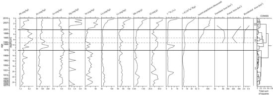 Vertical profiles of metals, nitrogen isotopes, and magnetic susceptibility in the Lugu Lake sediments and the tourist population in the watershed. On the right is the constrained incremental sum of squares (CONISS) based on elemental data. δ15N (nitrogen isotope ratios), χlf (low frequency magnetic susceptibility). The tourist population, Farmland Area, Forest Area and Residential Area data (1989–2010 AD) were obtained from Don et al. [] and Zhang et al. [].