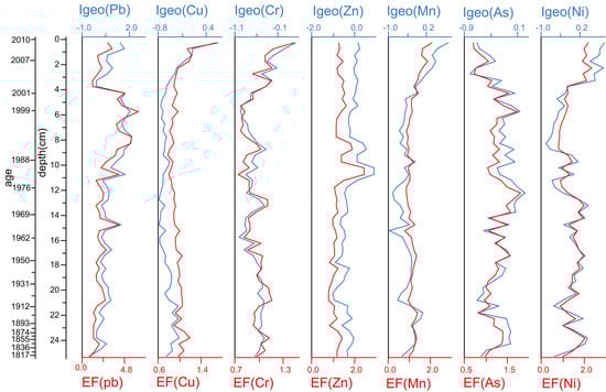 Geo-accumulation index (Igeo) and enrichment factor (EF) depth profiles of trace metals in the Lugu Lake sediment core. The blue and red lines represent Igeo and EF profiles respectively.