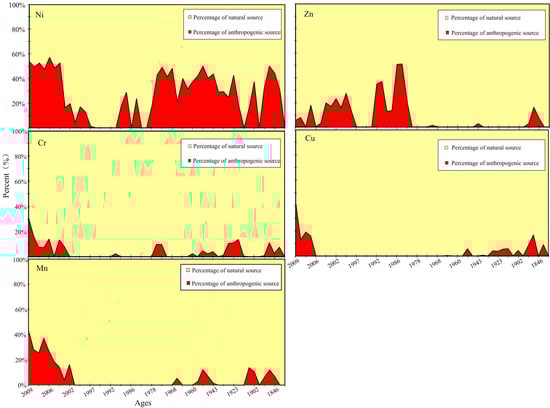 The anthropogenic and natural sources of several trace metals that are most relevant to human activities are shown in Figure 4, excluding Hg and As. The contributions of the different Hg sources cannot be calculated because most of the values were below the detection limit. Furthermore, most of the Igeo values for As in the whole sediment core were below zero, indicating that there has been no significant input of As into Lugu Lake, especially in recent decades.