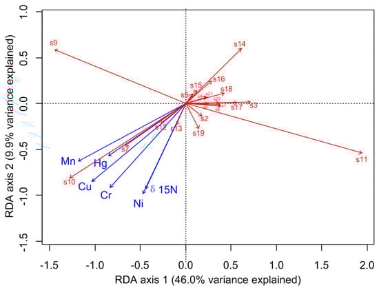 To analyze and verify the influence of the human impact on the changes in the diatom assemblages in Lugu Lake, the relationship between the sediment diatom species with a relative abundance greater than 1% and the sedimentary trace elements and δ15N that are related to human activities was analyzed using RDA ordination (Figure 5). Monte Carlo permutations and forward selection identified Mn, Hg, Cu, Cr, Ni and δ15N as significant environmental variables for RDA ordination analysis (p < 0.05, n = 36; Figure 5). The first two RDA axes were statistically significant, accounting for 46.0% and 9.9% of the explained variance, respectively. The nutrient-favoring species A. formosa and C. ocellata were positively correlated with all sedimentary trace metals related to human impact (r = 0.55 − 0.95, p < 0.01, n = 36), while the nutrient-favoring species C. dubius was only positively correlated with Mn (r = 0.50, p < 0.01, n = 36). Oligotrophic species P. brevistriata was negatively correlated with all the sedimentary trace metals (r = −0.4 − −0.76, p < 0.01, n = 36). Other benthic diatom species were negatively correlated with most of the metals. The results indicate that the increase in human activities reflected by sediment trace metals benefited the dominance of eutrophic species and was unfavorable to the oligotrophic species. Because the significant increase in trace metals occurred in Zone III, the third stage is the most significant stage of human impact on the succession of diatom assemblages.