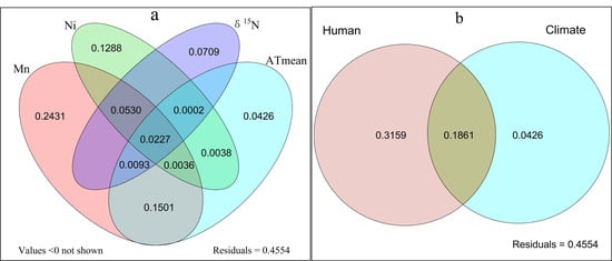 Plot of the variation partitioning analysis for diatom assemblages (during ca., 1951–2010 AD). (a) The four long ellipses from left to right represent effects of Mn, Ni, δ15N and annual temperature (ATmean) respectively, and the cross section represents co-influence. Residuals are the unexplained part. (b) The left red circle represents human impact independently, the right green circle represents climate impact independently, and the cross section represents co-influence. Residuals are the unexplained part.