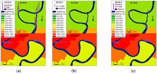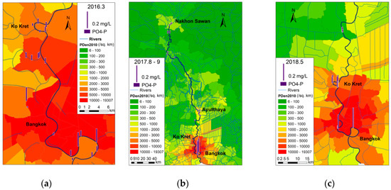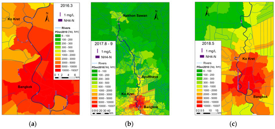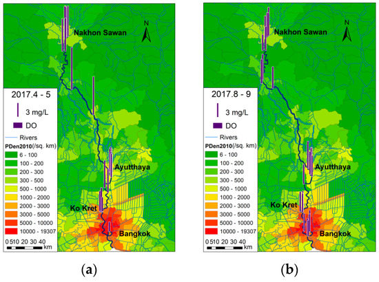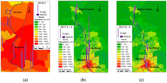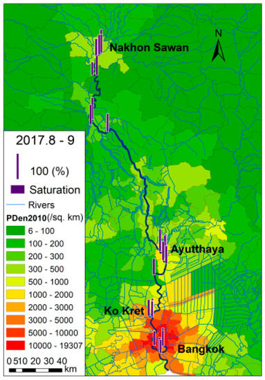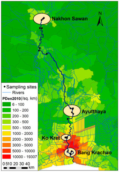 Although distinct spatial differences in water quality along the Chao Phraya River were identified and found to be highly related to anthropogenic stresses stemming from communities, industries, and agriculture [38], the existing data were still insufficient to provide the details of the spatial and temporal variations in the water quality of the river. In particular, the ways in which the characteristics of water quality in the river course change with the change in season and within a season are still poorly understood. Furthermore, considering the fact that the population in Bangkok has been steadily increasing and there is a large variation in population distribution within the watershed, another research question is how the population distribution is linked to spatial variations in water quality.