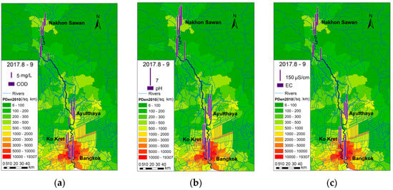 All measured concentrations of COD ranged from 5 mg/L to more than 10 mg/L. Regardless of season, COD appears to be correlated with population density. pH values were in the range of 7.2–8.3 and the maximum measured EC was about 260 μS/cm. The data obtained in the second half of the rainy season in 2017 are shown in Figure 7.