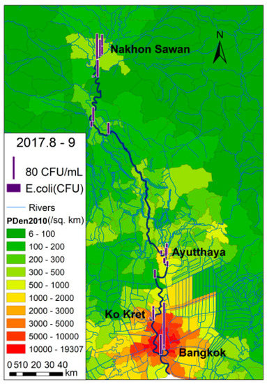 In the present study, the Chao Phraya River was chosen due to its persistent pollution, channel patterns, the population distribution in the watershed, and the significance of the river in Thailand. The primary objectives were: (1) to characterize the overall spatial and temporal variability of water quality in the Chao Phraya River at present, with a particular focus on water quality differences between the beginning and end of the rainy season in terms of both chemical variables and Escherichia coli (E. coli), and (2) to examine the water quality variation in relation to river bend, with an additional probe into phytoplankton communities in the river course, which has not been previously reported. A secondary objective was to provide an outlook on the relationship between the population distribution and spatial variation of water quality in the watershed, by mapping the two together.