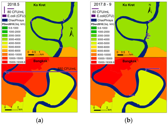 The spatial variation pattern of E. coli in the wet season was sag-curved, as depicted in Figure 8. It was higher in the upper and lower parts than in the middle. The reason for this is that there are inadequate and/or a lack of waste water collection and treatment facilities along the Ping and Nan rivers—the headstreams of the Chao Phraya River. The Chiang Mai Metropolitan Area has a population of nearly one million people and has been attracting over five million visitors each year. Therefore, during the wet season, large amounts of waste water could be transported into the waterways by overland surface runoff. It was reported that the total coliform bacteria at the Ratanakosin Bridge and Kanjanapisek Garden in Chiang Mai exceeds 1.6 million MPN/100 mL [48], which is at least 320 times the regulated standard surface water quality in Thailand. In the upstream section, it was observed that some public toilets were even placed on the river bank, and waste water was directly discharged into the waterway. It can also clearly be seen in Figure 8 that the less populated upstream area has a problem with E. coli of the same magnitude as the much more populated downstream area, which is caused by contamination dispersion from headwater regions. In Bangkok, the high level of E. coli contamination was caused by the large population, as evidenced by the fact that the levels of E. coli upstream of Bangkok were very low. The disproportionality between population and contamination is an issue of environmental ethics. More rigorous river management should be implemented in the Chiang Mai Metropolitan Area for the well-being of residents in both the Chiang Mai Metropolitan Area and Nakhon Sawan Province.