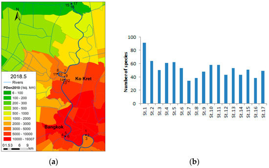 The sampling locations for the phytoplankton survey and the number of species identified at each location are shown in Figure 12a. Out of all the survey sites, the number of phytoplankton species was the highest on the left side bank of the Bang Krachao bend (Figure 12b).