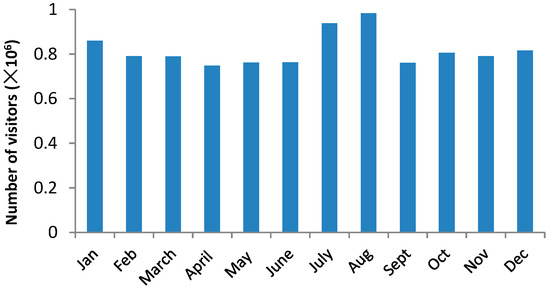The first flush phenomenon has been reported in previous studies [58,59] however, these studies were focused on a storm event. Therefore, a first flush usually refers to the initial surface runoff of a rainstorm, when the first runoff has a high concentration relative to runoff later in the storm event. The findings of the present study suggest that this concept may also be applied to a rainy season, which can be termed as a seasonal first flush. More importantly, the present study proposed a new concept of a duality of seasonal effect. Expanding the notion of the first flush in such a way highlights both the negative and positive roles of the rainy season, which may lead to a better understanding of river dynamics and better river management as well. Additionally, the present study also indicated that such a duality was not observed for E. coli. This implies a continuous loading of E. coli from the watershed to the river during rainy season. Because the flood risk along the Chao Phraya River is high, the E. coli-contaminated flood waters coming out the river channel will cause not only economic damage but also health damage. Since Bangkok is one of the world’s top tourist destinations, and the boat trip along the Chao Phraya river is a popular attraction for visitors, a high level of E. coli in the river can be considered a health risk to tourists. Despite this, the flood-related health issues have been largely overlooked up to now. On the other hand, since the number of visitors to Thailand peaks in August, as shown in Figure 14, the high level of E. coli in the rainy season may be partially attributed to tourists. Therefore, tourists in Bangkok could be both the victims of E. coli and one of the causes of the contamination.
