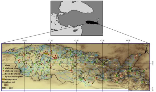 Study area, river, and distribution of hydropower plants, dams, and flow monitoring stations with sub-basin boundaries (red circles show closed stations, whereas green circles show open stations).