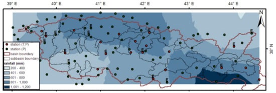 Since the Tigris Basin is large, several meteorological stations in the basin are operated by the State Hydraulic Works (DSI) and Meteorological Service (MGI). Using the stations that have a data period greater than any 10-year period between 1972 and 2011 (Figure 2), the average monthly precipitation, evaporation, minimum temperature, maximum temperature, and average temperature amounts were calculated. Since the records of meteorological and hydrological datasets did not overlap, various kinds of drought could be traced. Instead, only the rainfall map was depicted to interpret the spatial variability in rainfall over the basin. To accurately represent rainfall distribution, the homogeneity of the network with a continuous record length was required. Heterogeneity in the network distribution caused difficulties in interpolating measurements into a uniform grid []. Given physiological network weaknesses, the ordinary Kriging method was used to procure climatological information.