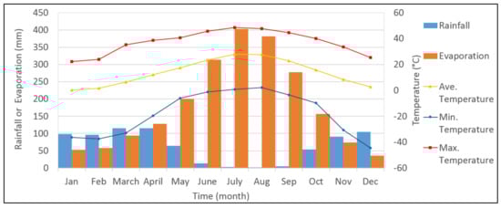 Average monthly precipitation, evaporation, minimum temperature, maximum temperature, and average temperature. We used 96, 15, and 21 meteorological stations for the average calculation of precipitation, evaporation, and temperature for the whole basin area, respectively.