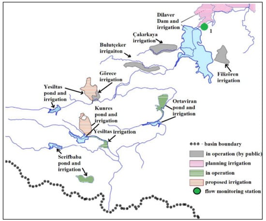 where and are the normalized flow and measured flow amounts, respectively; and is the upstream water consumption amount or water volume differences in the storage facilities. Figure 4 shows the storage facilities and irrigation areas (planning, proposed, and operational) located in the upstream part of the flow monitoring station 1. As seen in Figure 4, is the observed flow amount at station 1, and was the water volume amount that was stored in dams and ponds or used for irrigation purposes. In some of the irrigated areas, which are mainly operated by the public, the required water was directly supplied from the stream. For the report, using the records from the water storage facilities and water consumption data from the field, monthly net water consumption values, , were calculated. Estimation of the naturalized time series along the river was the hardest part of the master final report. Because a monthly time scale was used throughout the report, consistent estimations were obtained.